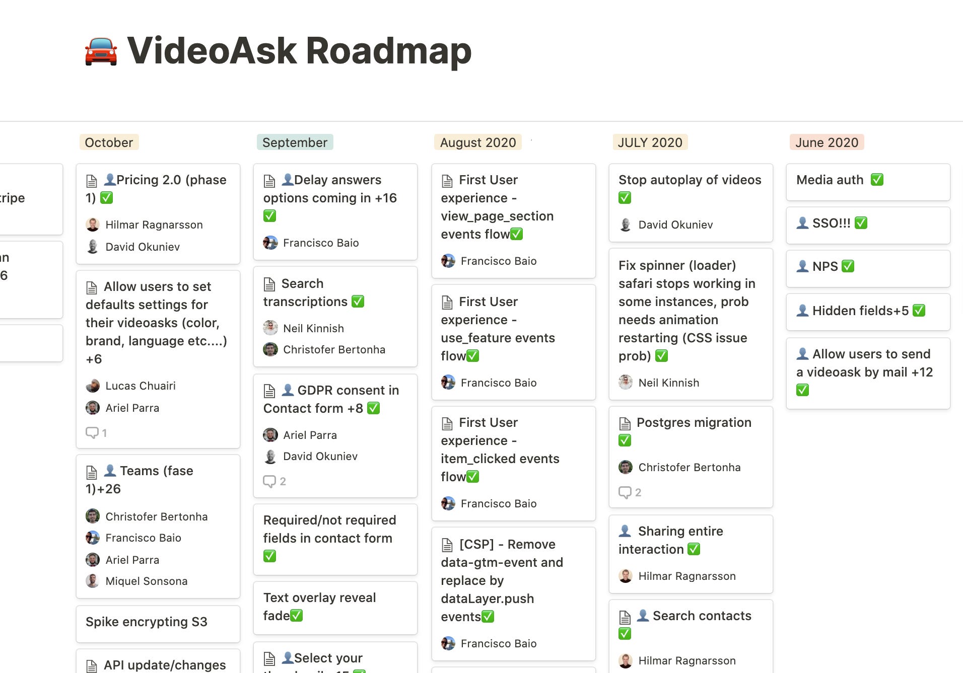 Our process is really simple and it allows us to ship fast. We reverse engineer the product value that we want to deliver. All I do is maintain a Notion board, kanban style. Each column is a month. I add the things that we should achieve this month in terms of user value and include a little spec inside the cards.